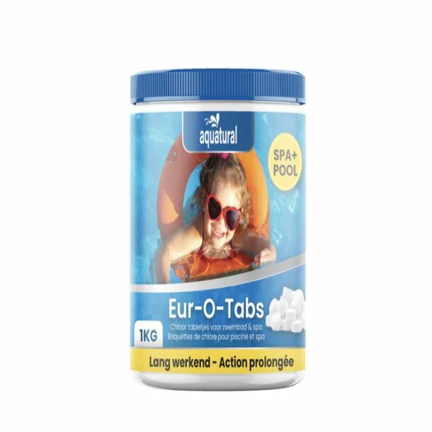 Aquatural Eur-O-Tabs chloortabletten zijn de ideale oplossing om het water in je zwembad, jacuzzi, spa of hot tub helder en hygiënisch te houden. De gestabiliseerde chloortabletten zijn van hoge kwaliteit en lossen langzaam op, waardoor je verzekerd bent van een constante afgifte van chloor. Bovendien werken ze beter door de langzamere afgifte en vervliegen ze minder snel door invloed van de zon. De handige hersluitbare verpakking van 1 kg is voldoende voor een heel seizoen.