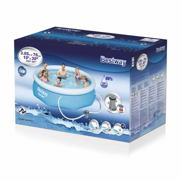 Duik met de hele familie in dit Bestway Fast Set zwembad. Een zwembad dat snel is op te zetten in de tuin. Blaas simpelweg de bovenrand op, en door het zwembad te vullen met water zet het bad zichzelf op. Het zwembad heeft een afvoerplug die aan te sluiten is op een tuinslang zodat het water tijdens het leeglopen te sturen is.