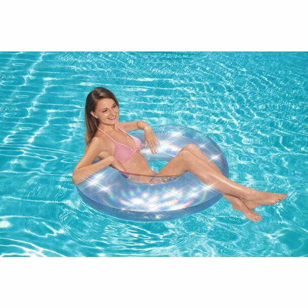 Lekker in het zonnetje op het water drijven op deze glinsterende Bestway Iridescent Zwemring dat reflecteert in het zonlicht en niet vervaagt in de loop van tijd. De zwemring is geschikt voor 1 persoon, heeft een maximaal draagvermogen van 90 kilogram en wordt geleverd inclusief reparatiepatch.