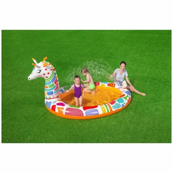 Fleur je achtertuin en de dag van je kleintje op met de Bestway Groovy Giraffe Opblaasbaar Speelzwembad. Ze zullen de hele zomer veel plezier beleven aan het spelen met dit safaridier. De heldere, groovy print, samen met de ingebouwde watersproeier, zal een letterlijke splash toevoegen aan de speeltijd!