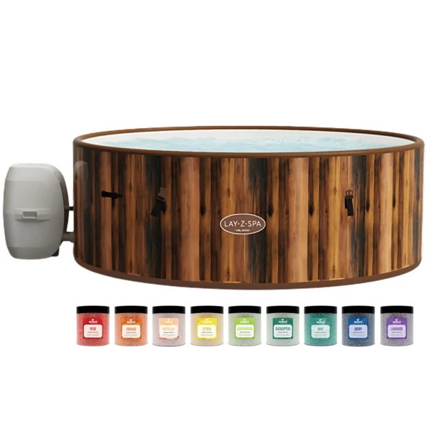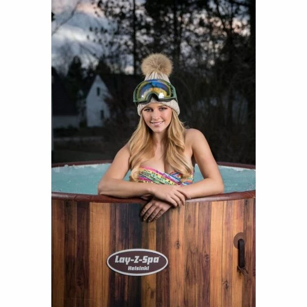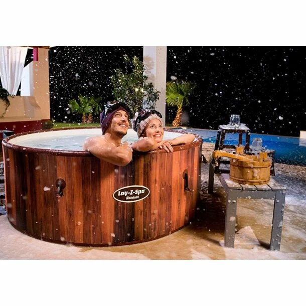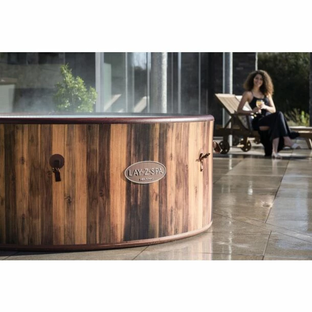 De Bestway Lay-Z-Spa Helsinki AirJet, een opblaasbare hottub met een ronde vorm met hout look, past perfect in de achtertuin.