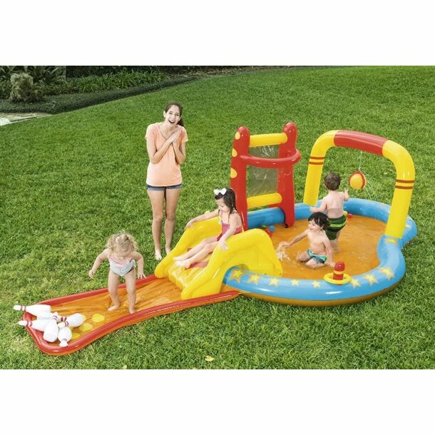Wie wordt de overall kampioen in dit multifunctionele Bestway Lil’ Champ Kinderzwembad? Laat je natsproeien door de draaiende bal, glij van de glijbaan en werp de kegels omver als een menselijke bowlingbal of ga basketballen. De zachte, opblaasbare bodem zorgt ervoor dat je heerlijk kunt spelen. De glijbaan is afneembaar.