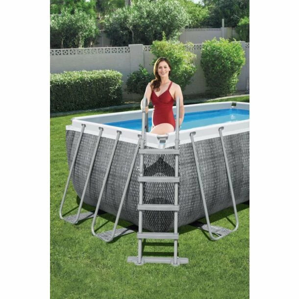 De realistische rotanprint van het Bestway Power Steel zwembad geeft de tuin een warme en stijlvolle uitstraling en de rechthoekige vorm biedt meer ruimte om te zwemmen en te spelen.