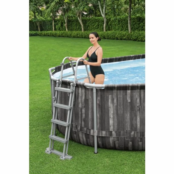 Het Bestway Power Steel zwembad is eenvoudig op te zetten en heeft corrosiebestendige metalen frames, een realistische houten paneelbedrukking aan de buitenkant en blauwe tegelbodem. Het unieke ovale ontwerp en de vorm maken dit zwembad compacter, waardoor er minder ruimte nodig is om het op te zetten en minder water om het te vullen en de ingebouwde afvoerklep, die wordt aangesloten op een tuinslang (met meegeleverde adapter), maakt het makkelijk om water af te voeren.