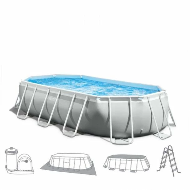 De sterke liner van het zwembad bestaat uit 3 lagen: een gerasterde polyester binnenlaag met aan beide zijden een duurzame en dikke PVC buitenlaag. De robuuste buizen van het witte frame hebben gepoedercoat staal. Dit Intex Prism Frame zwembad is voorzien van een bijpassende filterpomp met een capaciteit van 5.678 liter per uur en de set bevat daarnaast ook nog een grondzeil, een afdekzeil en een zwembadtrap.