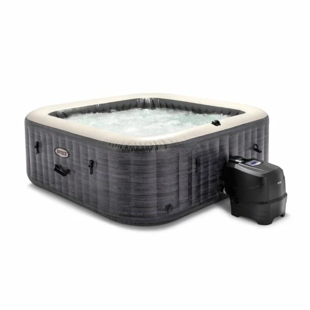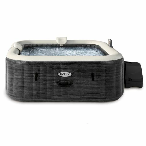 De Intex PureSpa 6 personen heeft een vierkante vorm, 170 bubblejets, een hard- en zoutwatersysteem en wordt geleverd met meerkleurige LED verlichting en twee luxe hoofdsteunen.
