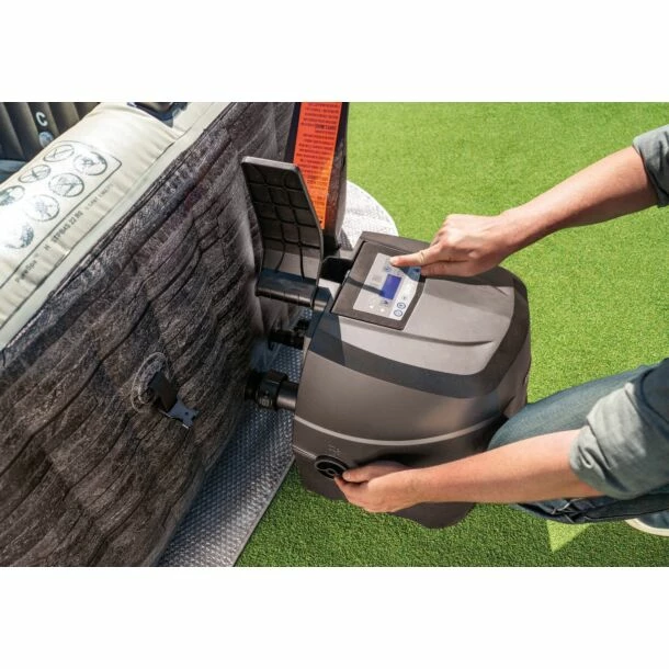 In de motorunit zit tevens het verwarmingselement. Het verwarmingselement warmt het water in de Intex PureSpa Whirlpool op tot een plezierige comfortabele temperatuur. Je kunt de watertemperatuur simpelweg instellen op het bedieningspaneel, waar je kunt kiezen voor een watertemperatuur tussen de 20° en 40°C. Het water in de Intex PureSpa Greystone Deluxe verwarmt zo’n 1,5° à 2,5°C per uur op, tot het de gewenste temperatuur heeft bereikt.